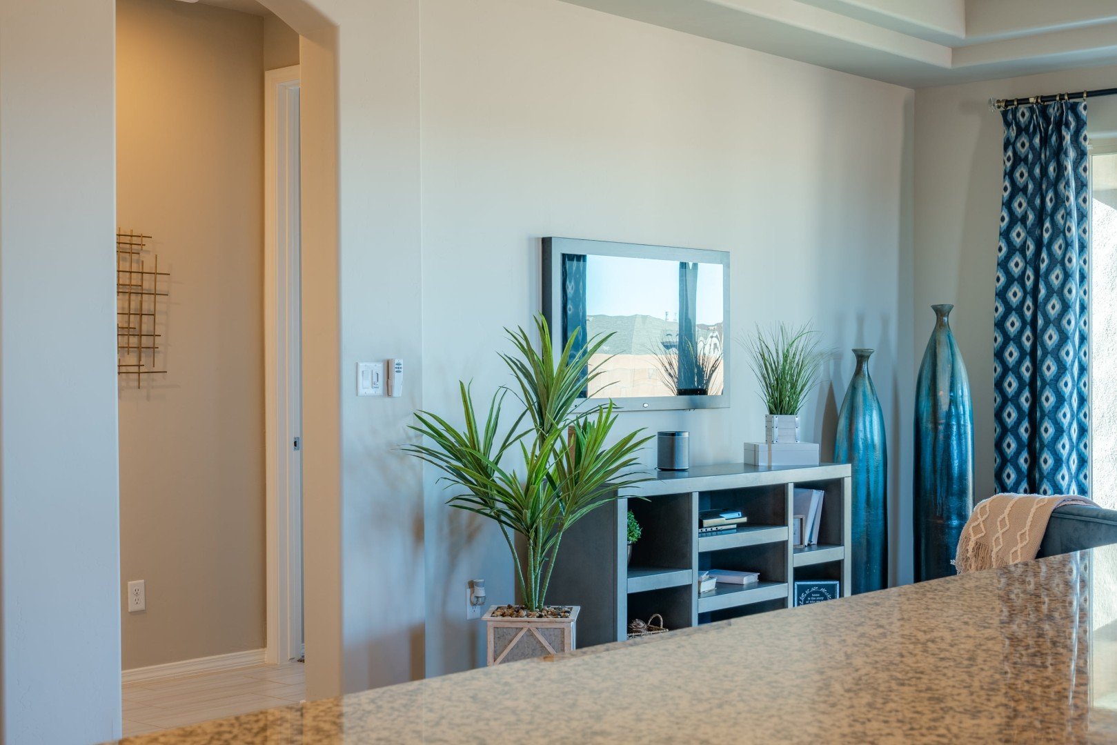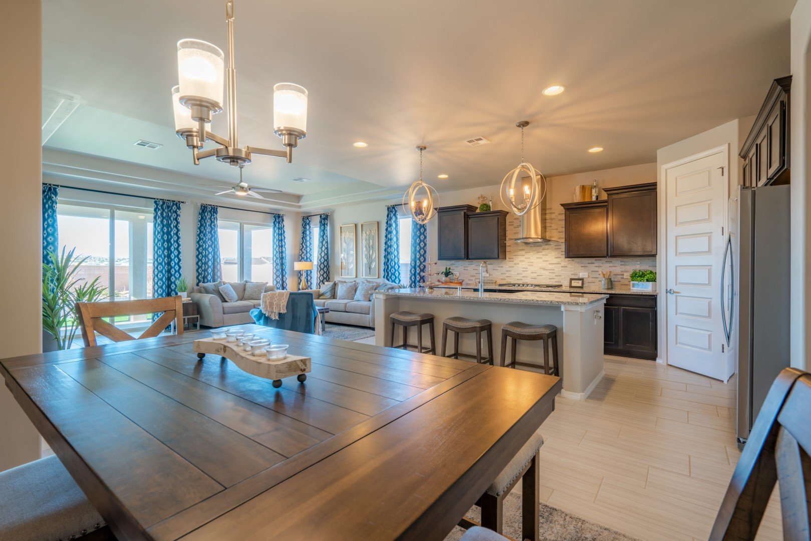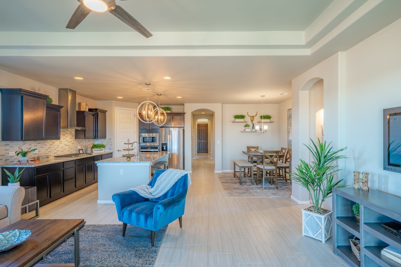 - Spacious great room is flanked by a modern kitchen with large island breakfast bar