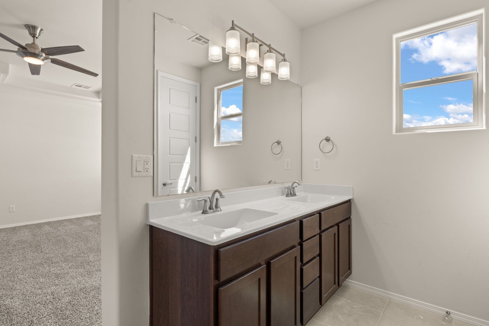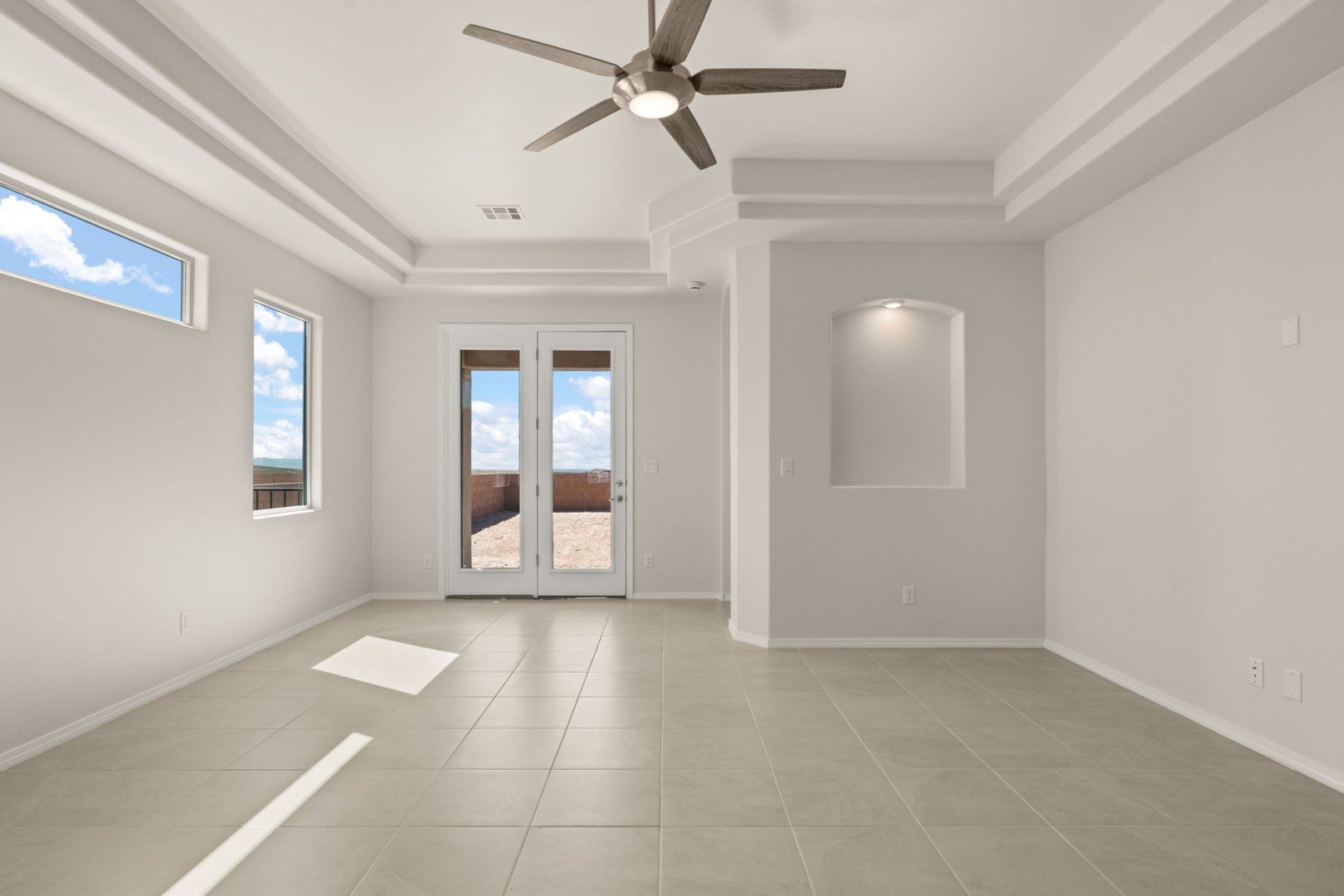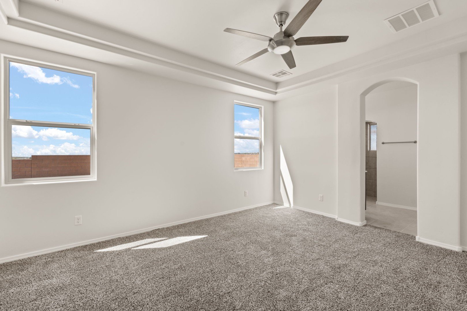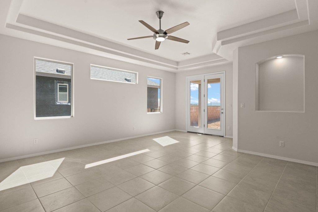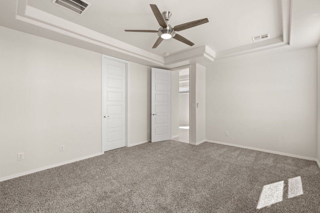 - Elegant owners suite includes tray ceiling, generous walk-in closet, and luxurious full bath