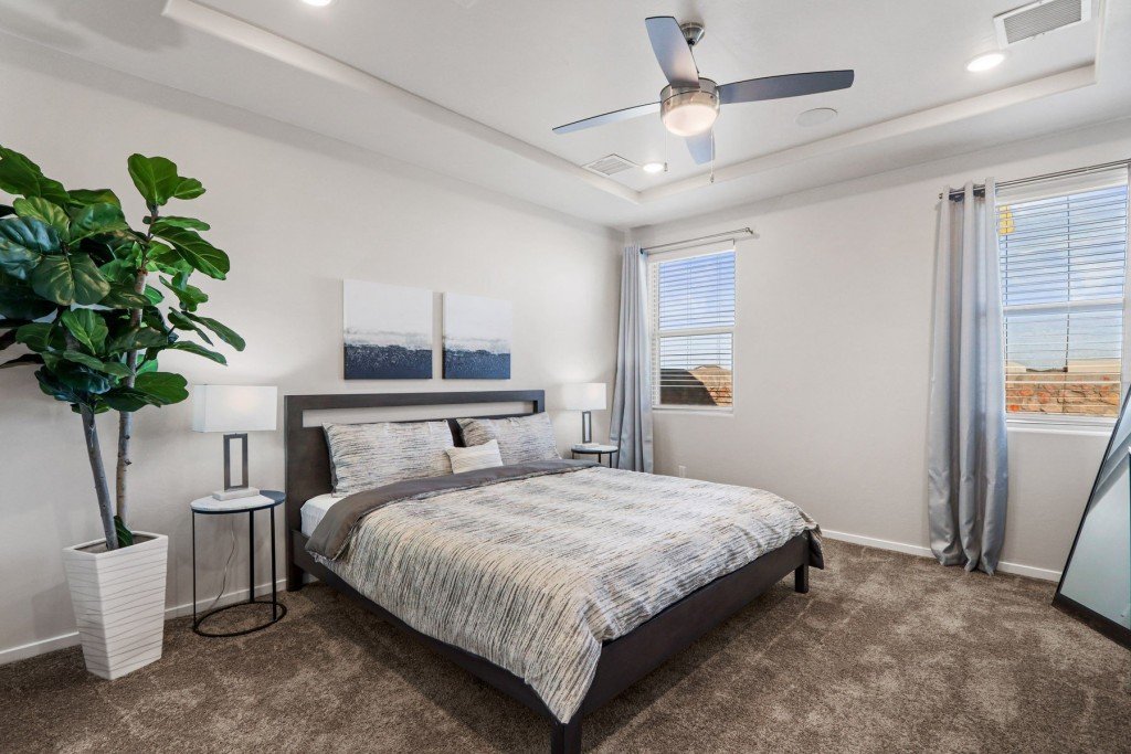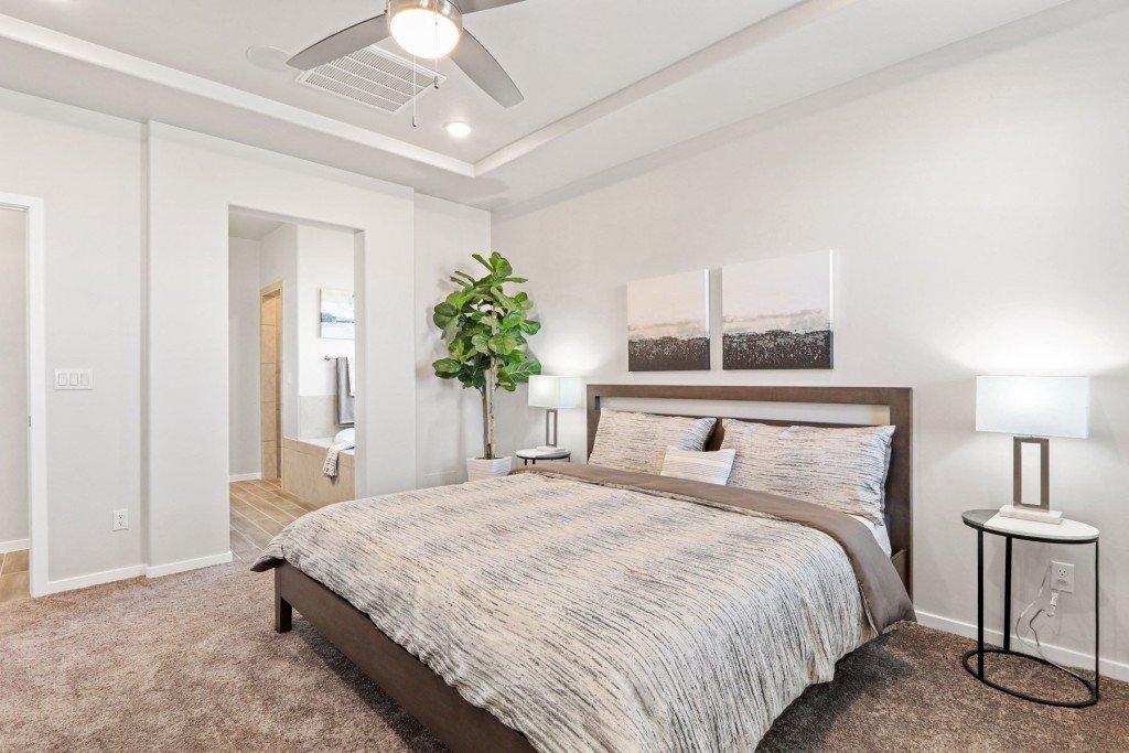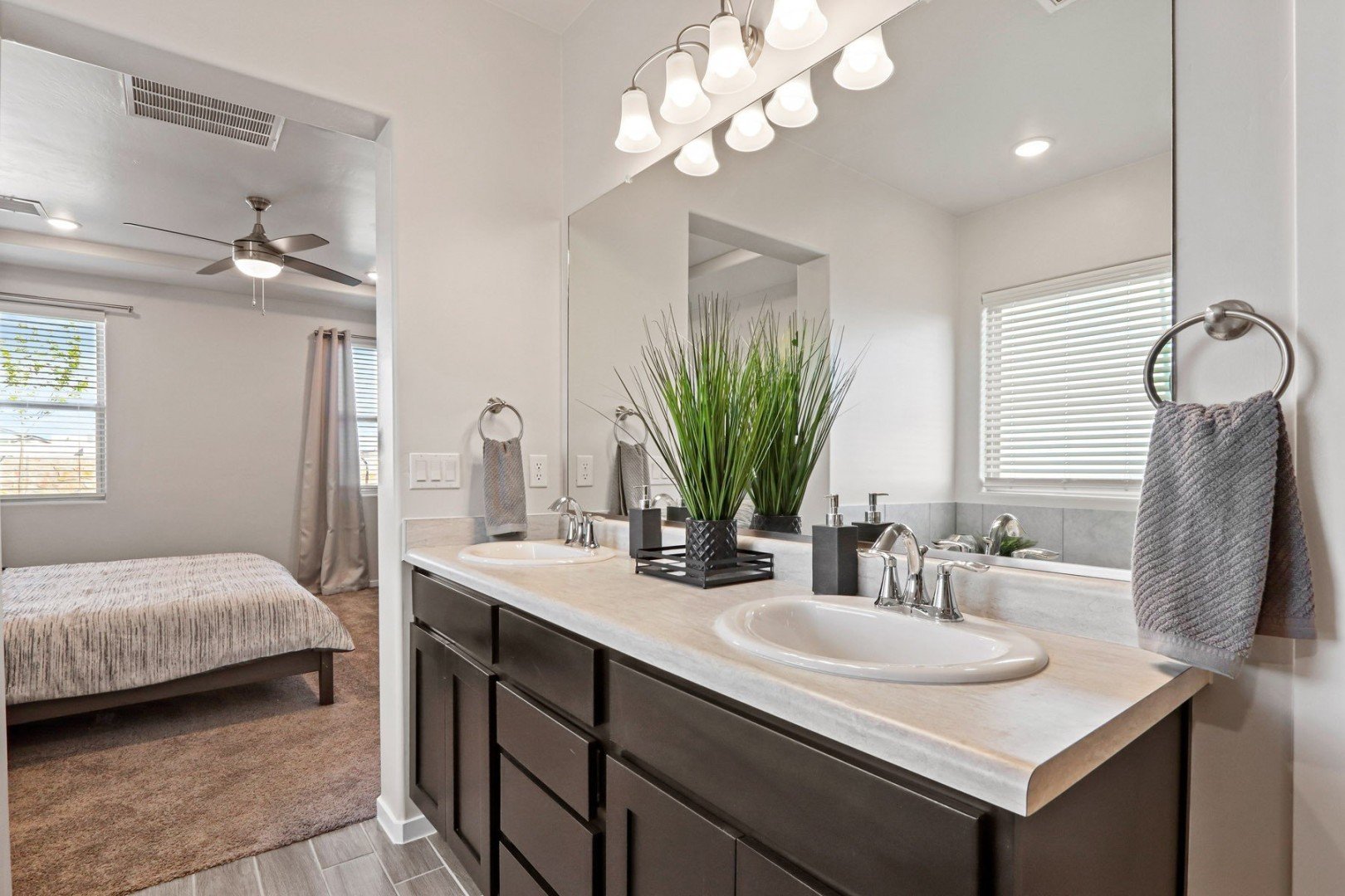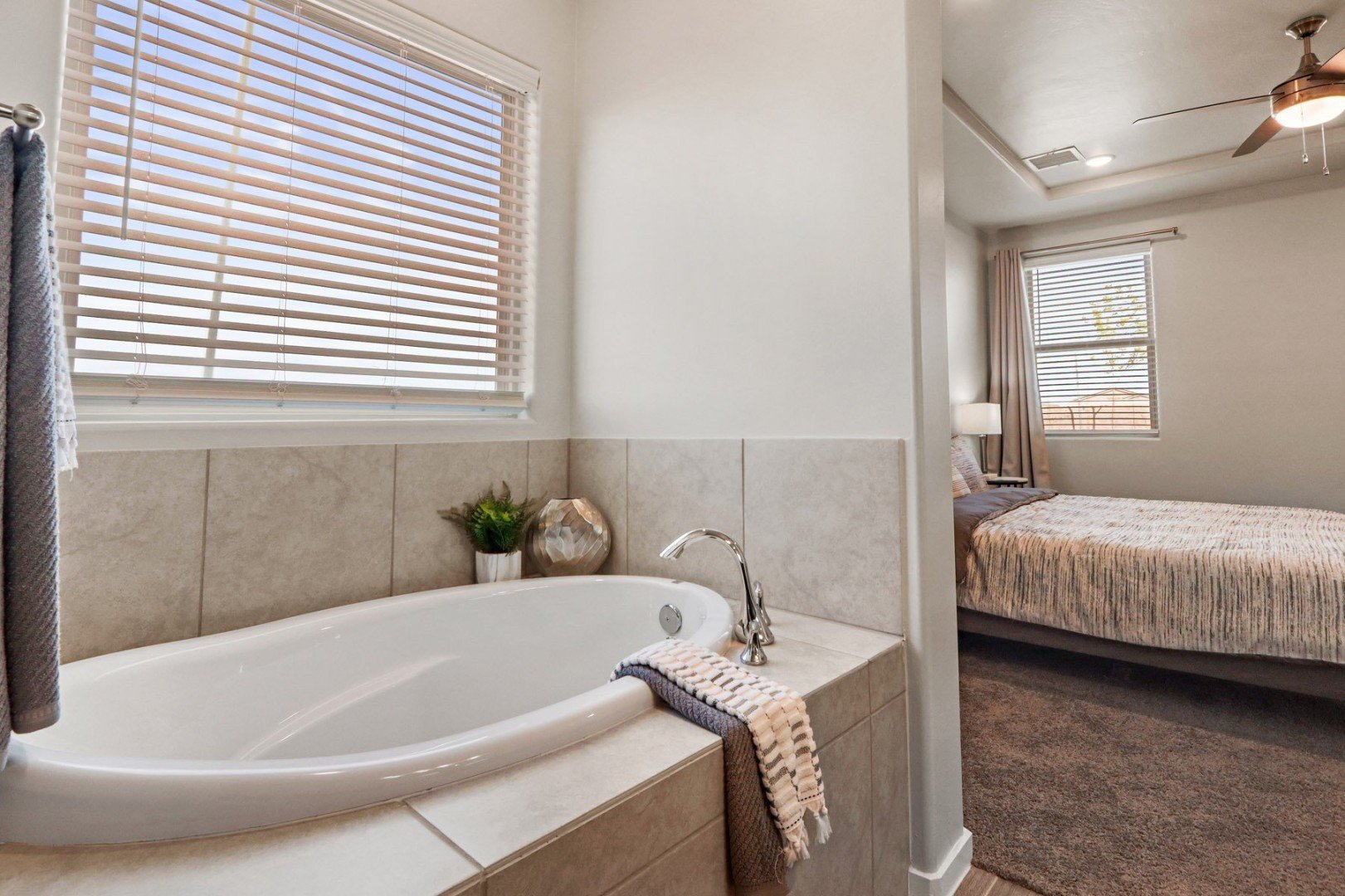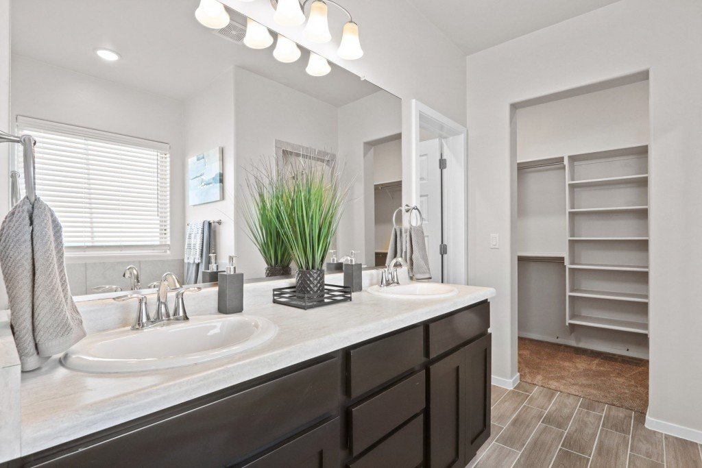 - Generous master suite includes dual vanities, relaxing tub with separate shower, and an expansive walk-in closet