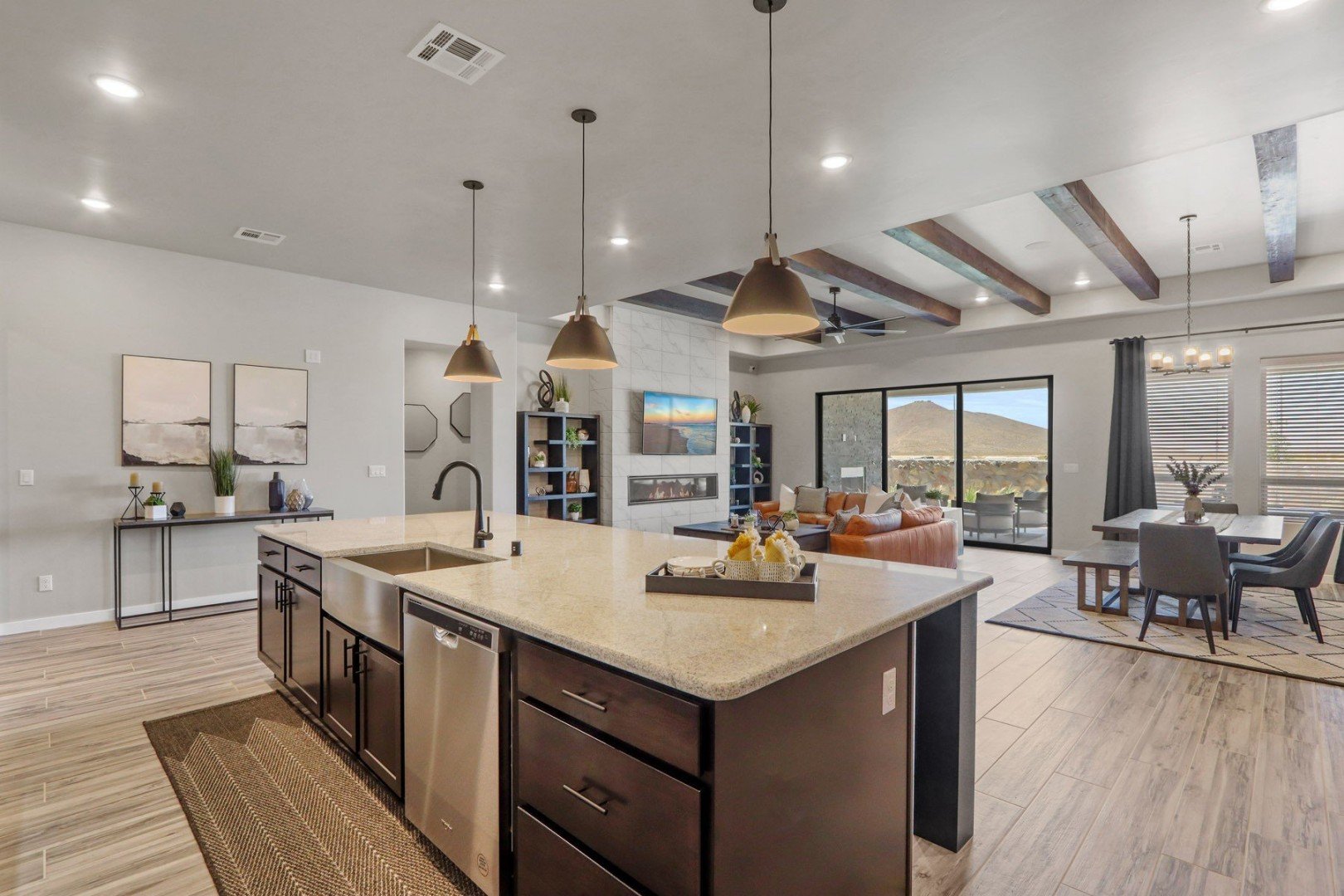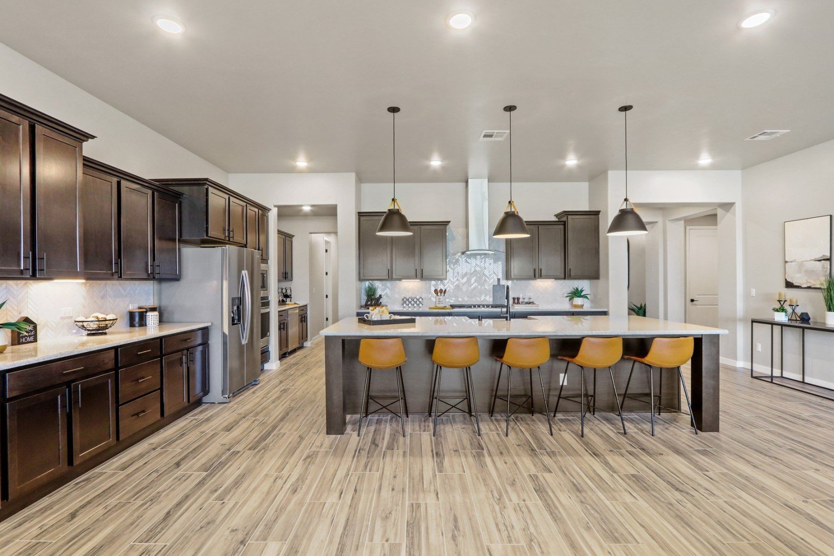 - Stunning, upscale kitchen with spacious island serves as the heart of a smart design that features private bedroom enclaves, flex space, and striking architectural details