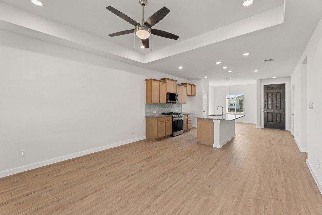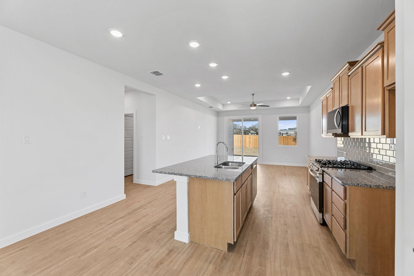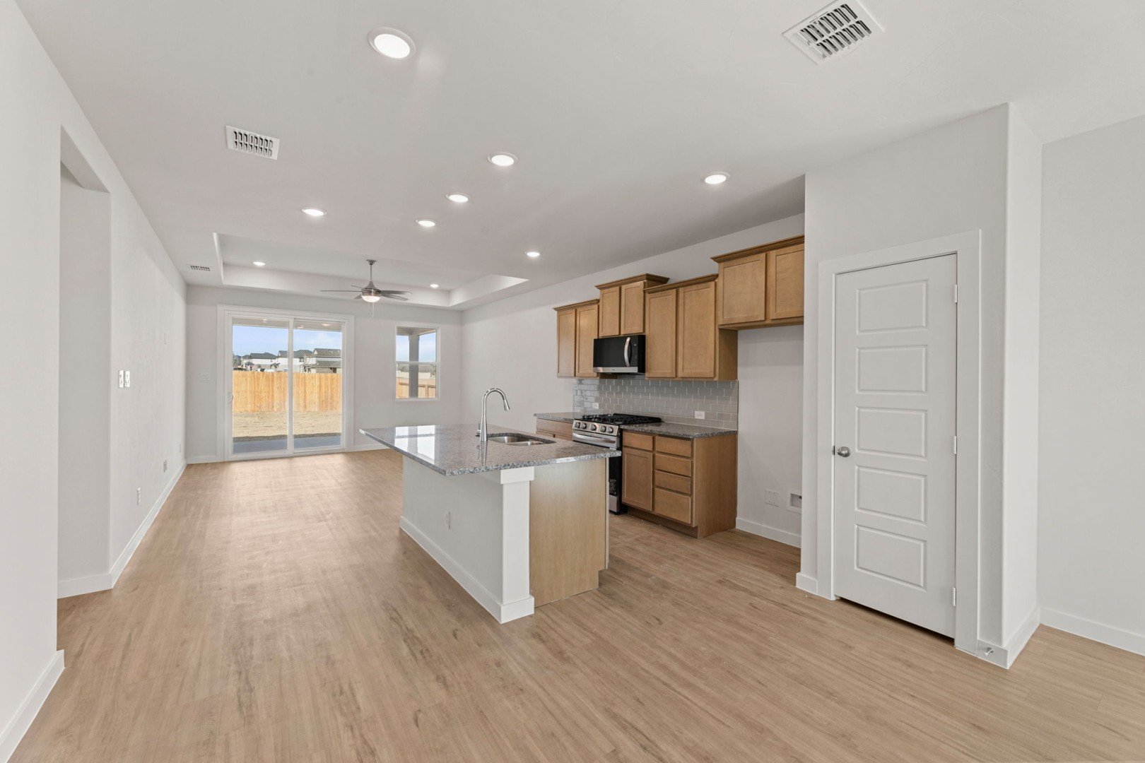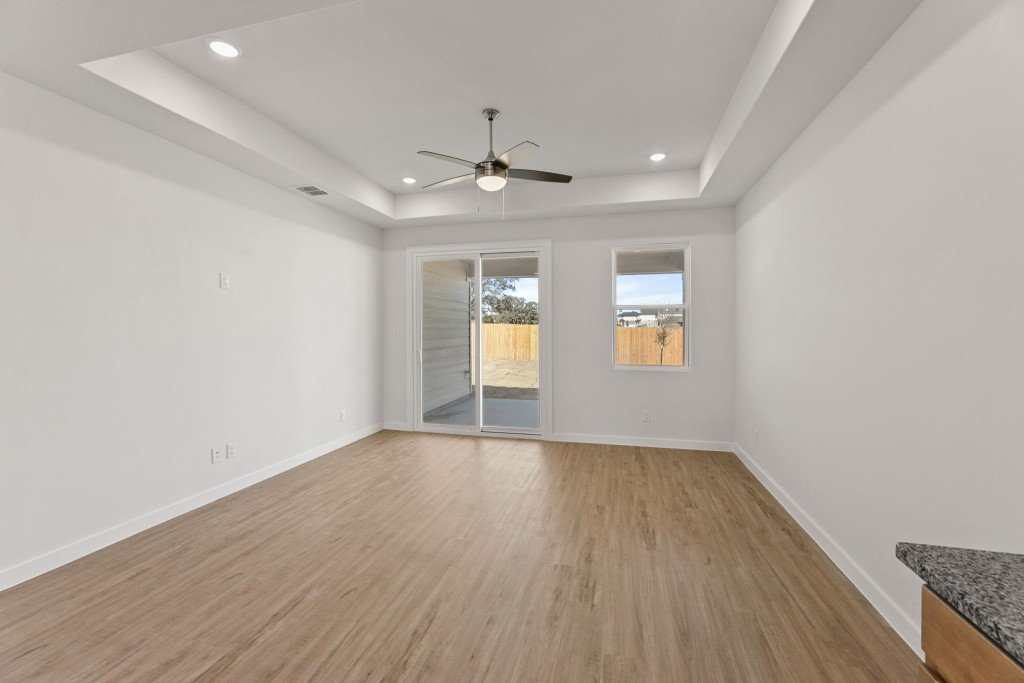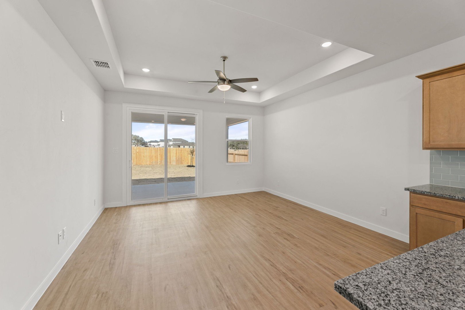 The Clovis combines modern style with family-friendly functionality in a thoughtfully designed single-story layout. Step through the charming front porch, an ideal spot to enjoy your morning coffee or greet neighbors, and into the heart of the home. The expansive open-concept living area creates a warm and welcoming atmosphere. The kitchen is a chef’s delight, featuring sleek countertops, a large center island, and ample cabinetry for all your cooking essentials. Adjacent to the kitchen, the dining area provides the perfect space for family meals, while the great room offers a bright and airy retreat with large windows that frame serene backyard views. The master bedroom is a relaxing sanctuary, complete with a spa-inspired ensuite featuring double vanities, a walk-in shower, and a spacious walk-in closet. The two secondary bedrooms, positioned near the main living areas, provide comfort and flexibility for family members, guests, or even a home office. The outdoor living spaces are equally inviting. A covered backyard patio creates a seamless indoor-outdoor flow, perfect for hosting gatherings or unwinding in the fresh air.